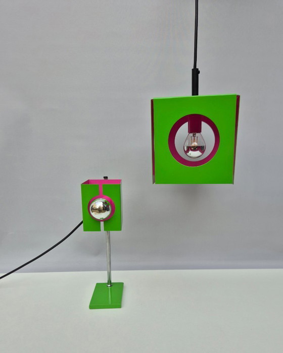 Découvrez ce charmant ensemble composé d'une suspension et d'une lampe de table. Malheureusement, nous ignorons la marque. Les deux lampes sont en très bon état, avec de légères traces d'usure.