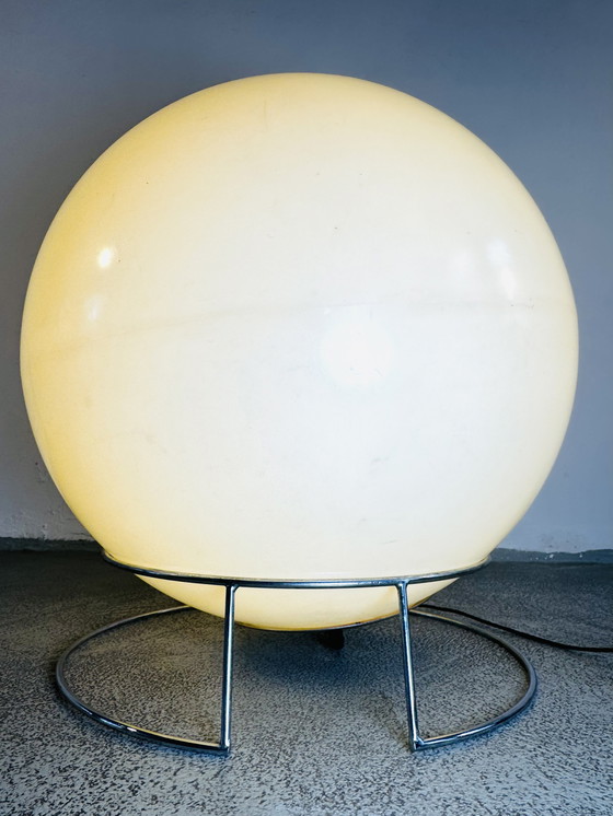 La lampe se compose d'un grand globe en plastique blanc cassé, qui diffuse une lumière chaude et atmosphérique. Il est maintenu dans un cadre circulaire mince et chromé, qui reflète la forme du globe et crée une silhouette harmonieuse et minimaliste. Le design fait référence aux formes planétaires - d'où le nom Saturnus - et incarne l'esprit futuriste du design du début des années 1970.