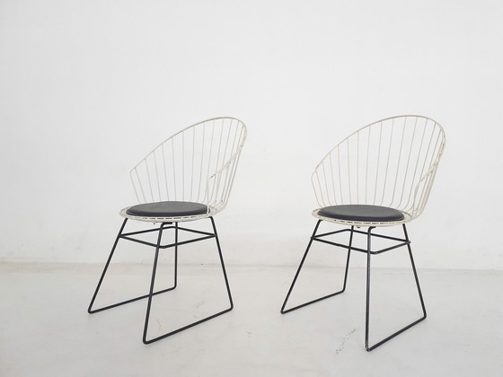 2 x D. Dekker pour Tomado Chaises en fil de fer en blanc et noir avec coussins en cuir vinyle. L'une d'entre elles a été repeinte. Largeur : 55cm ; assise : 41 cm Profondeur : 55cm, assise : 40cm Hauteur : 85cm ; assise : 44cm Adriaan D. Dekker était designer pour Tomado. Tomado était une entreprise néerlandaise de produits ménagers.