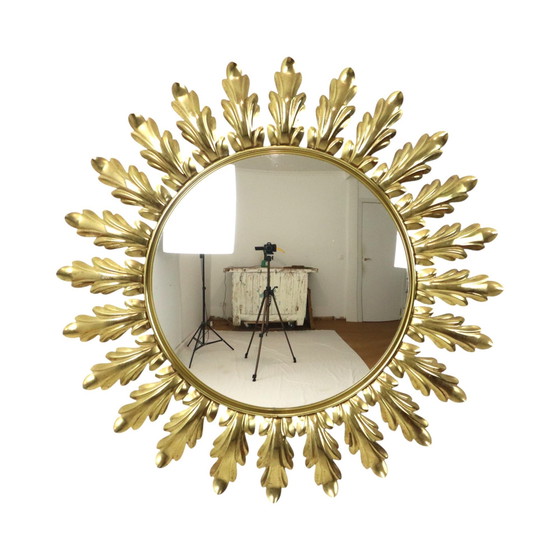 Miroir Mid Century sunburst par Deknudt, en métal cuivré et bois, avec verre miroir convexe ou convexe, objet design des années 1960, Belgique. La maison belge Deknudt, fondée en 1946 et spécialisée dans les miroirs, est connue pour sa qualité supérieure et son design élégant et intemporel. Rare dans cet état, habituellement le métal doré est complètement oxydé ou terni, celui-ci brille presque aussi beau que le jour où il a été fabriqué ! En très bon état, avec seulement d'infimes signes d'âge et d'utilisation, tels qu'une légère décoloration et une marbrure de la couche de cuivre, l'objet porte une très belle patine d'âge, voir les photos pour plus de détails ! Dimensions : 50 cm de diamètre, 3 cm de profondeur, miroir de 29,5 cm de diamètre. Poids : 1,400 kg.