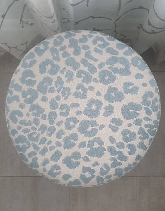 Ce pouf présente un motif abstrait raffiné d'inspiration animalière, dans des tons bleus doux sur une base blanc cassé. Le revêtement s'arrête à 1 cm du sol et une finition discrète protège le tissu.