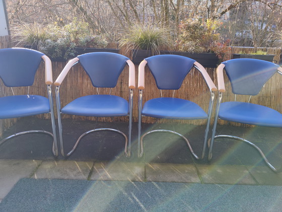COMME NEUF - la quatrième chaise présente de légères traces d'usure | Design vintage classique | Pièce de collection des années 90 | Bois massif et acier/chrome. Marque : Kusch+Co. J'en possède 4.