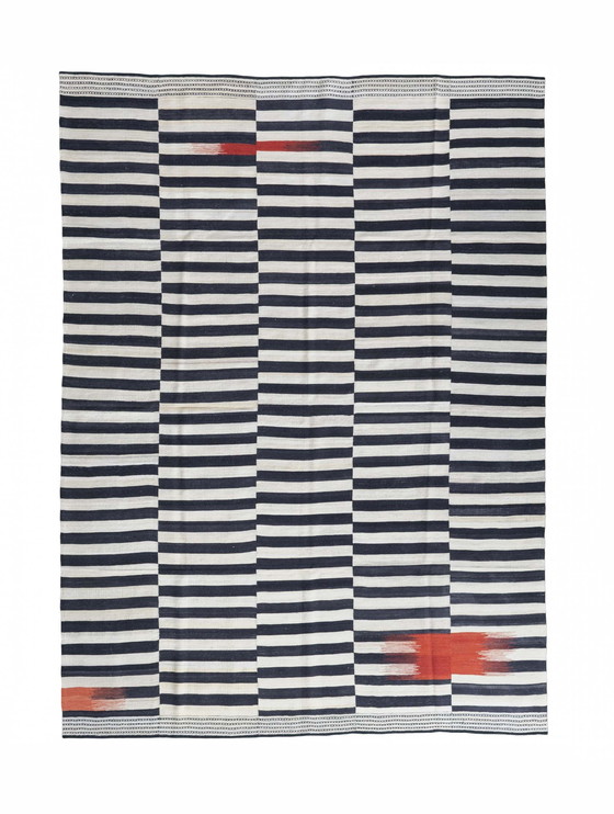 Un kilim de designer moderne, tissé à la main, à l'esthétique minimaliste et à l'effet graphique. Le motif à rayures noires et blanches est interrompu par de subtiles touches de rouge - un changement de style délibéré qui rend le design captivant et unique.
