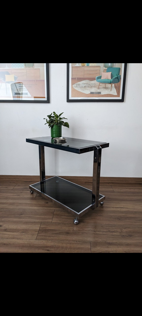 - Fabriquée avec des matériaux robustes, cette desserte est dotée de plateaux en verre fumé et d'une structure en métal chromé, garantissant durabilité et style.