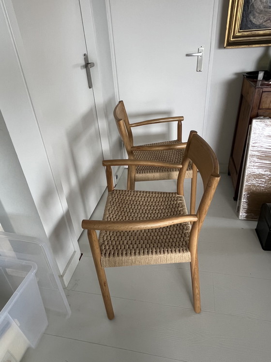 Deux belles chaises de salle à manger qui sont malheureusement devenues excédentaires suite à un déménagement. Peu utilisées. Fabriquées sur commande par MADE en 2022 dans le style de Niels Otto Müller avec des sièges en corde de papier.