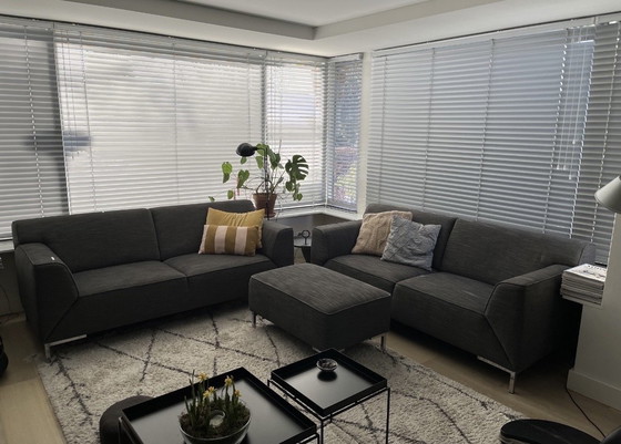 Deux canapés modernes et confortables en tissu gris. Un pouf assorti est inclus. Chaque canapé est vendu séparément. Le pouf est offert pour l'achat de deux canapés. Les canapés sont imperméabilisés et en bon état. Ils ne sont pas affaissés. Nous vendons ces canapés car nous souhaitons acquérir un canapé d'angle.