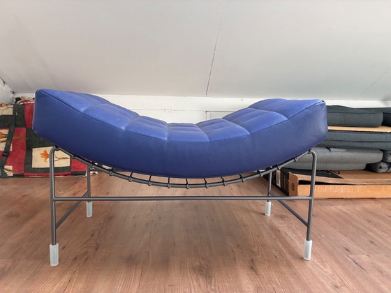 Deux fauteuils Leolux Volare avec leur repose-pieds assorti, d'un bleu éclatant. Ces fauteuils modernes sont revêtus de cuir haut de gamme et possèdent une structure métallique robuste. Parfaits pour un coin salon élégant et confortable.