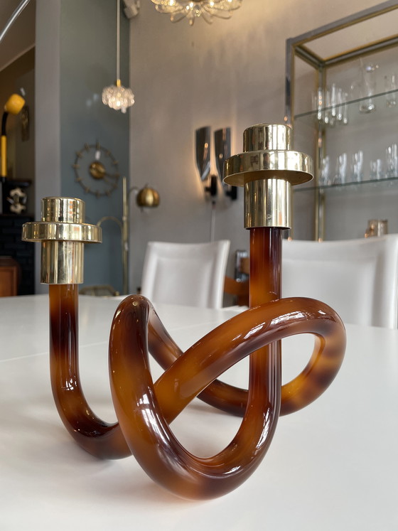 Illuminez votre espace avec l'élégance intemporelle du bougeoir Bernstein de Dorothy Thorpe. Ce somptueux bougeoir se distingue par son design captivant, avec sa structure en verre tourbillonnante, évoquant l'art moderne du milieu du XXe siècle. La riche teinte brune du verre s'harmonise à merveille avec les accents de laiton brillant, créant un mariage de matériaux raffiné.