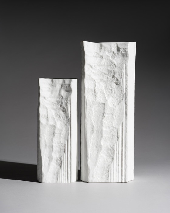 Réalisés en porcelaine biscuit blanche mate à l'intérieur brillant, ces deux vases forment un puissant dialogue sculptural. Ils incarnent l'un des moments les plus stimulants de la création de porcelaine allemande d'après-guerre, où convergent l'Op Art, les reliefs et le langage brut des surfaces.