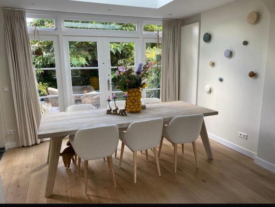 La table de salle à manger Biot en chêne blanchi donne un coup de jeune au style minimaliste. Le plateau rectangulaire repose sur des pieds angulaires et effilés. N'oubliez pas que le chêne européen massif est un matériau vivant. Bien qu'il ait été fabriqué par des experts, il continue à se développer, ce qui signifie que la surface peut présenter des mouvements naturels et de légères variations de couleur.