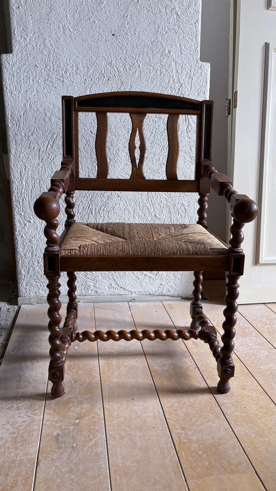 Deze prachtige set van antieke eiken stoelen brengt een vleugje tijdloze elegantie in uw interieur. De stoelen zijn vervaardigd uit hoogwaardig eikenhout en hebben een verfijnde afwerking die hun klassieke charme benadrukt. De zittingen zijn bekleed met gevlochten riet, wat niet alleen comfort biedt maar ook een authentieke uitstraling geeft.\n\n- Gemaakt van duurzaam eikenhout met een rijke bruine tint.\n- Gevlochten rieten zittingen voor extra comfort en stijl.\n- Klassiek ontwerp dat perfect past in zowel traditionele als moderne interieurs.\n\nVoeg deze antieke stoelen toe aan uw woonruimte en geniet van hun schoonheid en functionaliteit. Neem vandaag nog contact op voor meer informatie of om een bezichtiging te plannen.