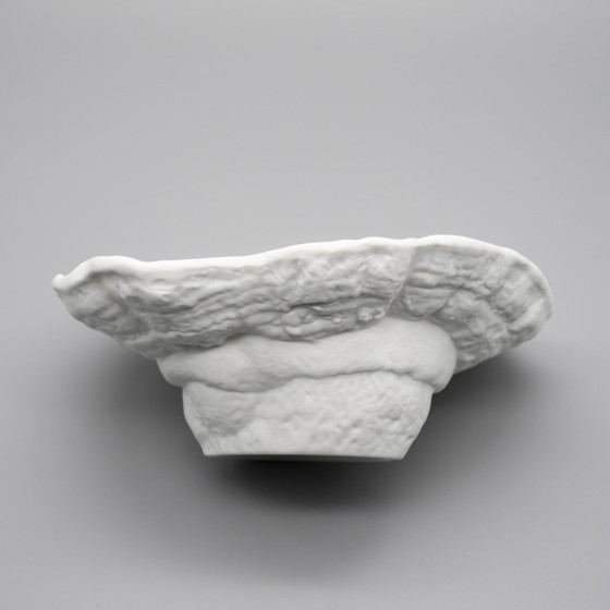 Le contraste entre l'extérieur **en biscuit mat** et la **surface intérieure émaillée** crée une tension visuelle et tactile à la fois ancienne et avant-gardiste. Son bord irrégulier évoque le bord ondulant d'un corail ou d'un chapeau de champignon - fragile, végétal, tranquillement surréaliste. Pourtant, la pièce conserve la retenue raffinée typique de la **porcelaine allemande du milieu du siècle**, enracinée dans l'héritage du Bauhaus et les sensibilités modernistes.