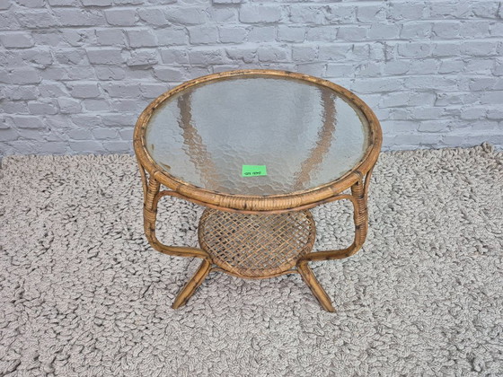 An elegant vintage bamboo side table with softly curved legs, a finely woven rattan magazine shelf and a transparent textured (hammered) glass top. The flowing lines and lighter proportions give this table a more refined appearance than standard bamboo models, while the natural materials add warmth and character. The construction is solid and well-balanced, making it both decorative and practical as a side or occasional table. In good vintage condition, with light wear consistent with age. Dimensions: Height 56 Width 75 Depth 75 cm.