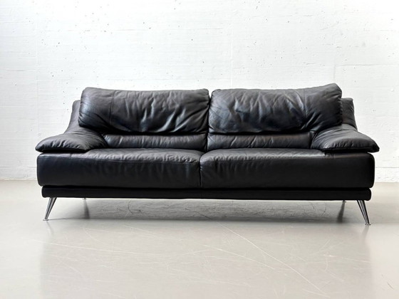 Un canapé trois places spacieux du fabricant italien Natuzzi, revêtu d'un cuir véritable noir de haute qualité au grain fin. Les coussins d'assise et de dossier moelleux, ainsi que les larges accoudoirs profilés avec leurs coussins intégrés, confèrent au canapé une allure particulièrement confortable et accueillante. Le dossier légèrement incliné favorise une posture détendue et souligne le confort caractéristique du design Natuzzi. Les pieds fins et fuselés en métal créent un contraste moderne avec la structure volumineuse et donnent au canapé une agréable légèreté visuelle malgré ses dimensions généreuses. Les lignes épurées des panneaux latéraux et du dossier assurent un style sobre et intemporel, idéal pour les salons raffinés.