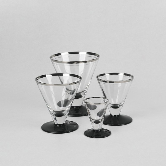 Chaque verre présente un calice transparent, un fin liseré argenté et un pied en verre noir du plus bel effet, alliant contraste géométrique et luxe, caractéristiques du design belge des années 1930.