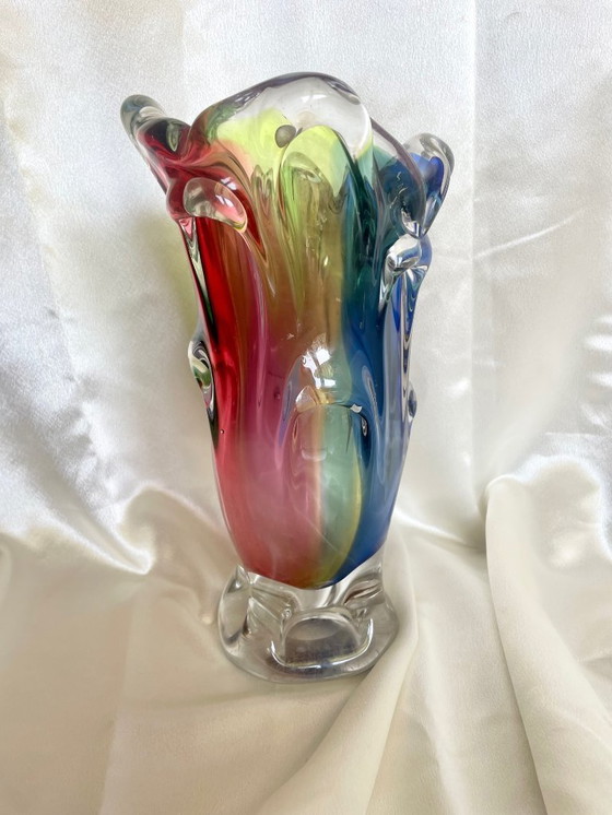 Ce magnifique vase à bourgeons multicolore est une pièce unique de verre d'art soufflé à la bouche datant des années 1960, fabriquée à Marinha Grande - le cœur de la tradition verrière portugaise.