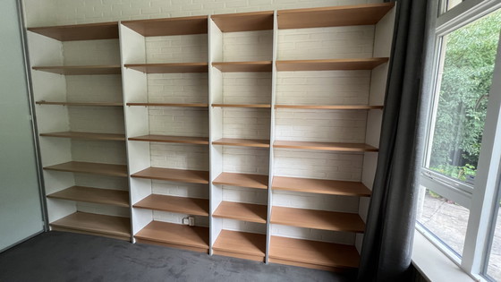 Cette armoire murale exclusive en hêtre de 3,25 mètres de long offre une solution de rangement spacieuse avec plusieurs étagères. Son design moderne s'intègre parfaitement dans tout espace de vie ou de bureau. Fabriquée en bois de haute qualité, l'armoire a une finition élégante qui est à la fois stylée et fonctionnelle. Elle est idéale pour ranger des livres, des décorations ou d'autres objets.
