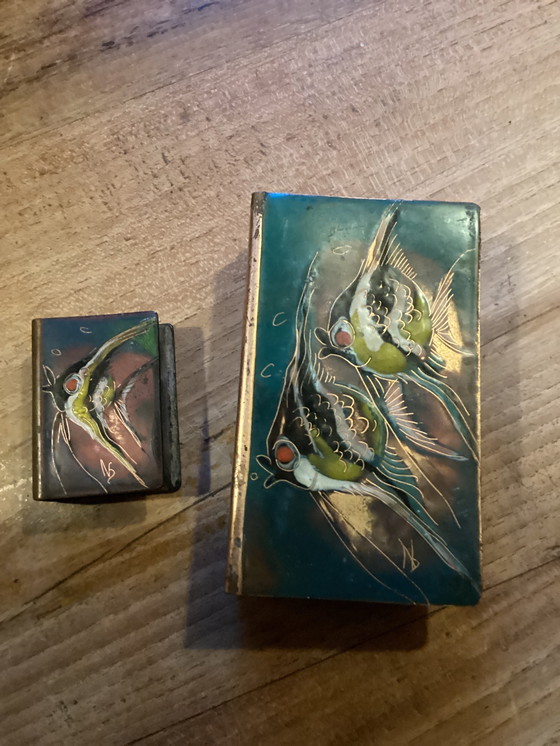Remontez le temps avec ces superbes porte-allumettes vintage en émail signés Nelly Damsma, datant des années 1960-1970. Ces charmantes pièces arborent un motif de poissons éclatant, témoignant du savoir-faire et de la finesse artistique de l'époque. Parfaits pour ajouter une touche d'élégance rétro à votre décoration intérieure, ces porte-allumettes sont non seulement fonctionnels, mais aussi de ravissants objets de conversation. Exposés sur une cheminée ou offerts en cadeau original, ils dégagent un charme nostalgique qui ne manquera pas de séduire.