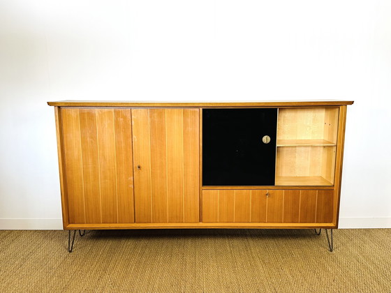 Enfilade haute scandinave vintage datant des années soixante composée de deux portes de rangement avec étagères et d’une vitre coulissante (peinte en noir). Dimensions : H117 L219 P39