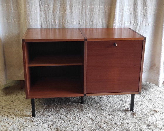 So design ! Enfilade de style moderniste en teck (placage) design A.R.P. Atelier de Recherche Plastique (P. Guariche, J.A. Motte et M. Moter) pour les Hûchers de Minvielle. Elle est formée de 2 modules cubique, l'un fermé par une porte battante ouvrant sur une étagère et l'autre ouverte avec étagère. Le piétement en métal noir n'est pas d'origine; il est neuf. Sobre et minimaliste, elle trouvera sa place au salon, dans une entrée ou une chambre.
