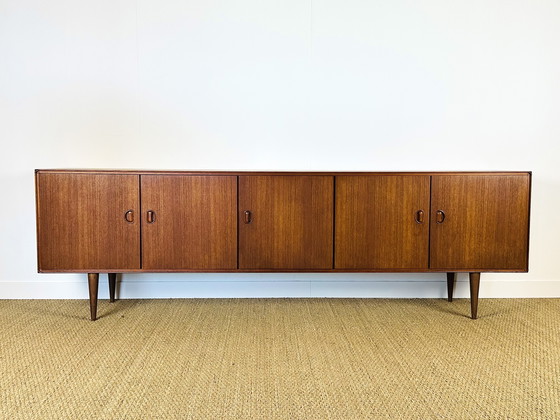Ce modèle séduit par ses lignes minimalistes, ses poignées sculptées intégrées et son élégant piètement compas, typiques du mobilier nordique de cette période. Sa belle longueur en fait une pièce idéale en buffet, meuble TV ou rangement de salon.