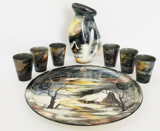 Très bon état général. Une égrenure sur un verre. Plateau. Diamètre 38,5 cm. Pichet. Hauteur 27 cm. Longueur 17 cm. Largeur 10 cm. Verre. Hauteur 9,5 cm. Diamètre 7,5 cm. Magnifique ensemble.