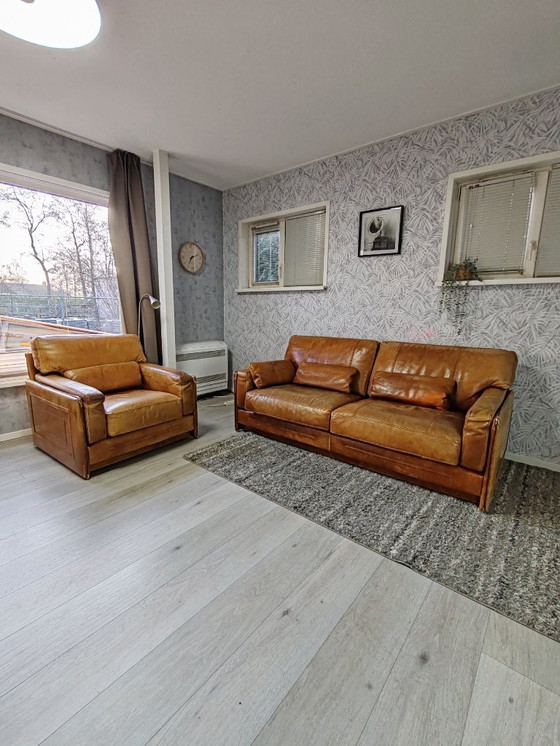 Matériau : Ce canapé est confectionné en cuir épais couleur cognac ou en cuir de buffle, réputé pour sa robustesse et sa capacité à se patiner avec le temps.