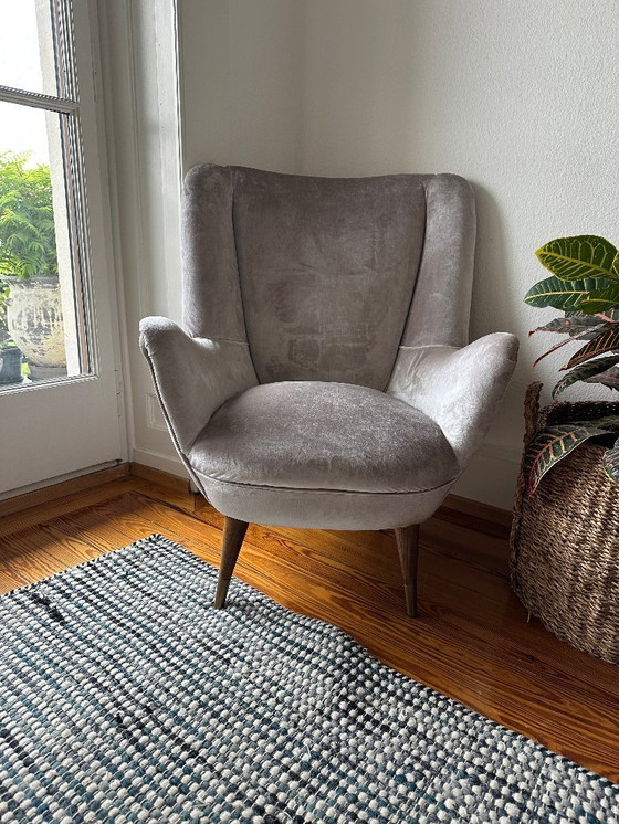 La pièce est en très bon état, de légères marques sur le velours pourraient être adoucies en passant le tissu à la vapeur lors de la réception. Veuillez noter que la couleur du velours est 'oyster' sur la chaise et comme il est réfléchissant, il est difficile d'obtenir un bon rendu avec une photographie à la lumière naturelle.