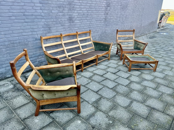 Cet ensemble de salon vintage danois est fabriqué en teck de haute qualité et offre un design intemporel et élégant. L'ensemble se compose d'un canapé, de fauteuils et d'un ottoman, tous équipés de coussins confortables dans des textiles classiques verts et jaunes. Le cadre en teck robuste garantit la durabilité de l'ensemble, ce qui en fait un complément parfait pour tout espace de vie à l'esthétique vintage ou moderne du milieu du siècle. L'ensemble a besoin d'un peu d'amour car il est resté au même endroit depuis 1967. Les coussins méritent un nouveau rembourrage (il s'agit de coussins non fixés, ce qui n'est pas trop difficile et donc pas trop cher/le rembourrage peut normalement coûter un peu cher) et les coussins simples ont également besoin d'être remplacés pour un bon confort. En résumé, un ensemble de salon très complet qui a besoin d'un peu d'attention.