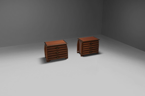 Réalisées en placage de noyer richement veiné et en éléments en noyer massif aux nuances variées, ces commodes présentent un effet de superposition captivant qui ajoute profondeur et intérêt visuel.
