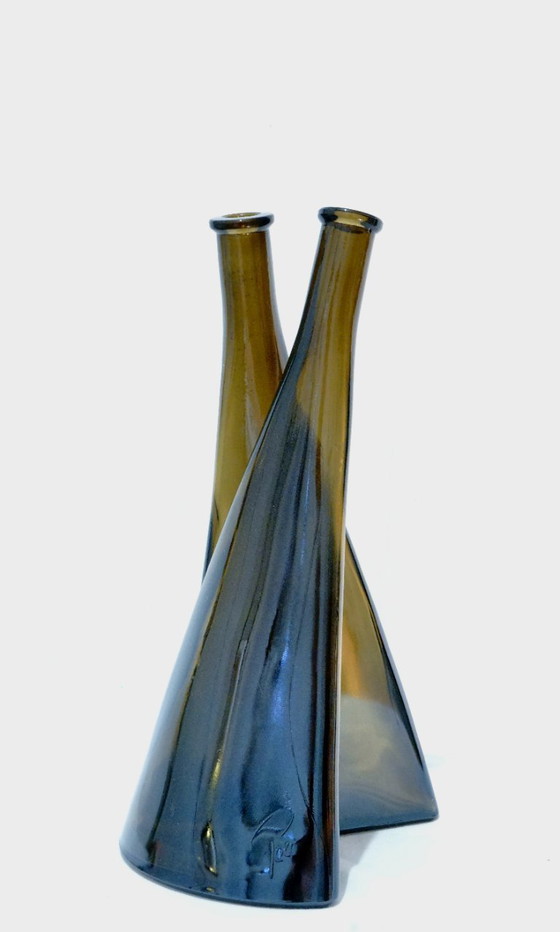 À vendre : une paire unique de bouteilles vintage en verre d'art, signées O. Frey & Cie S.A. Berne (Suisse). Ces bouteilles iconiques « Paco » se distinguent par leur forme asymétrique sculpturale et sont réalisées en magnifique verre ambré/brun.