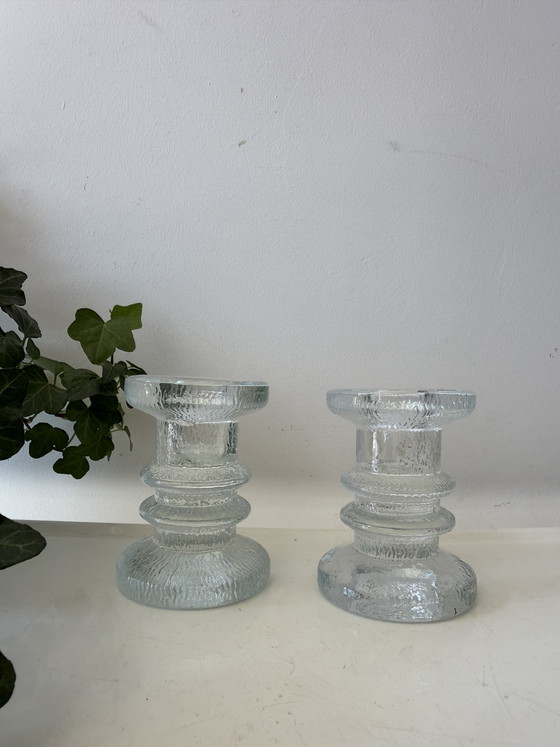 Superbe ensemble de 2 chandeliers Luminarc en verre transparent au relief caractéristique. Modèle compact avec un pied robuste et une belle forme étagée. Évoque le style Iittala. Q176