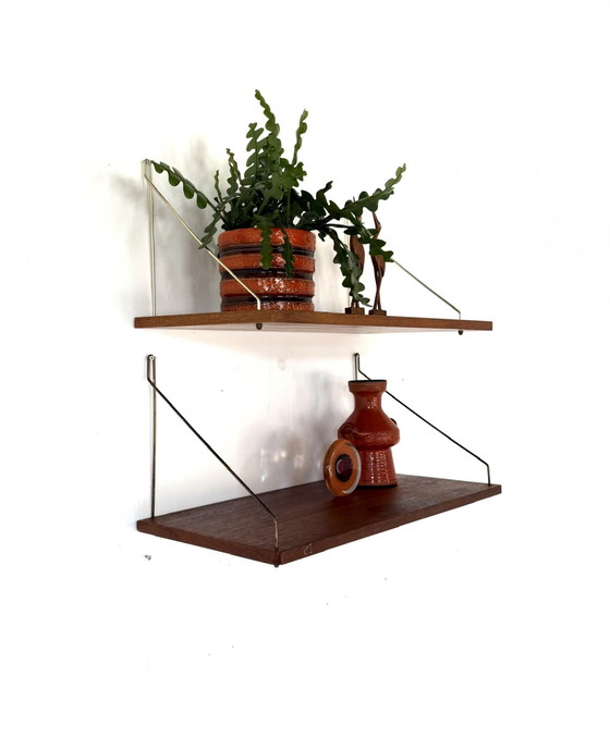 Magnifique ensemble, finition teck aux tons chauds et veinage apparent. Les étagères sont dotées d'un système de fixation en laiton et se fixent facilement avec seulement deux vis. En très bon état. Idéal pour habiller un mur et mettre en valeur vos plus beaux objets.