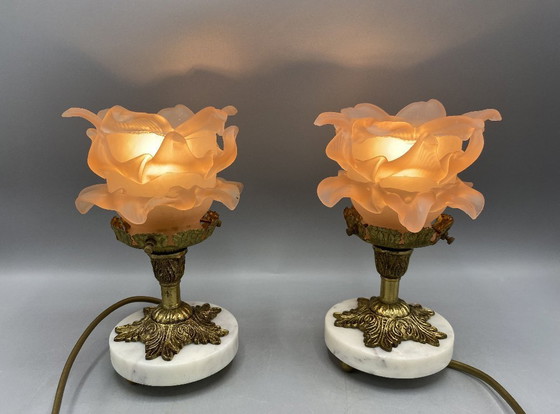 Ensemble de 2 lampes de table Art nouveau • Abat-jour en verre dépoli rose en forme de fleur