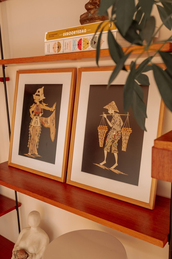 Ensemble de 2 œuvres d'art orientales du Mid Century en provenance d'Indonésie. Les œuvres sont en bambou sculpté. Elles sont toutes deux encadrées professionnellement avec un passe-partout et un cadre en bois avec verre.