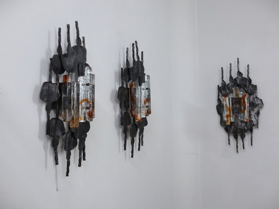 Ensemble de 3 appliques / lampes murales Brutalist en verre de Murano Italie 1970