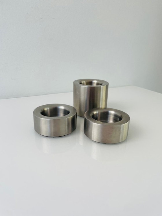 Ensemble élégant de 3 chandeliers design Brabantia en acier inoxydable brossé. Leur design minimaliste et leur forme cylindrique sobre leur confèrent une allure à la fois intemporelle et moderne.