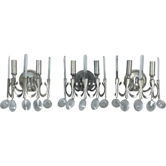 Très bon état vintage avec traces d'âge et d'utilisation pour cet ensemble de trois appliques à double lumière de Sciolari, modèle Ovali. Fabriquées en laiton nickelé et verre et produites en Italie dans les années 60. Etiqueté avec l'étiquette d'origine. Fonctionne selon les normes européennes, adaptable sur demande aux normes américaines.