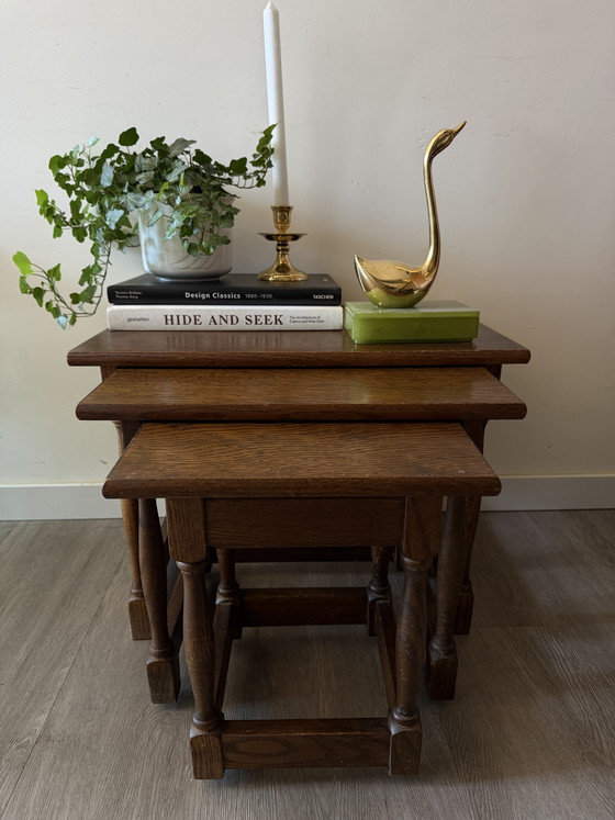 Joli ensemble de trois petites tables en bois emboîtables. Bois foncé au grain marqué et pieds tournés. Plateaux aux tons chauds. Légères traces d'usage. Q186