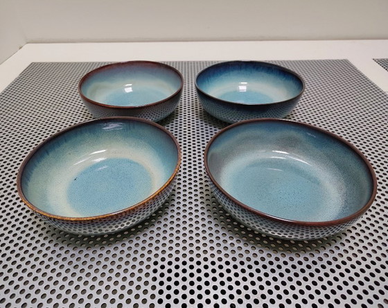 Ensemble de quatre bols de haute qualité en faïence émaillée réactive bleue.