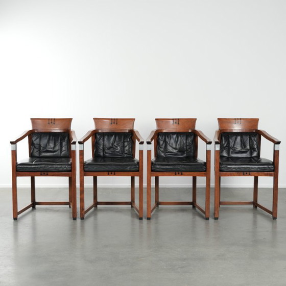 Ces chaises luxueuses, confortables et élégantes sont signées Schuitema, la prestigieuse marque néerlandaise reconnue pour sa qualité, son design et le choix de ses matériaux. Elles arborent les finitions soignées caractéristiques de Schuitema. Elles s'intègrent harmonieusement à tous les intérieurs. Dotées d'accoudoirs, elles présentent une magnifique structure en bois de style Art déco et des assises et dossiers revêtus d'un luxueux cuir noir. Ayant été utilisées avec soin pendant des années, elles présentent des traces d'usure normales. Leur structure est en bon état et elles sont prêtes à l'emploi. Avec un entretien approprié, elles vous offriront de nombreuses années de confort et de plaisir visuel.