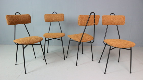 Très bel ensemble de 4 fauteuils italiens, années 1960. Fabriqués en acier laqué noir et nouvellement recouverts de tissu bouclé.