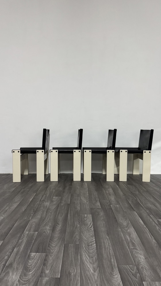 L'ensemble proposé, composé de quatre chaises originales acquises dans les années 1980, se distingue par une combinaison de couleurs aujourd'hui extrêmement rare et qui n'est plus produite : une structure laquée blanche associée à une assise et un dossier en cuir noir. Cette variante, bien que régulièrement disponible au catalogue à l'époque, était moins populaire que les versions en bois naturel et, de ce fait, est devenue quasiment introuvable, comme le confirment les archives de Molteni&C.