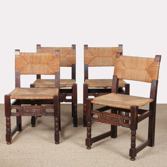 Cette suite de quatre chaises en bois massif est une fabrication française des années 1940. La structure présente des lignes sobres, mises en valeur par des montants avant en bois tourné et une traverse sculptée. Les assises et les dossiers sont paillés. Ces chaises sont conservées dans un bel état d’origine et présentent une patine homogène.