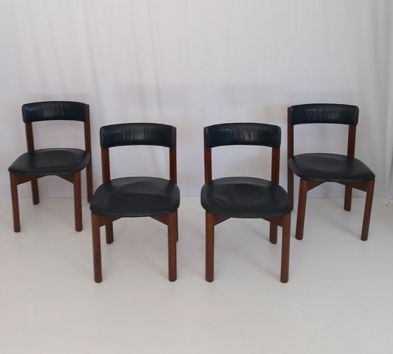Voici un ensemble de 4 chaises vintage d'une qualité exceptionnelle, produites par Sorgente del Mobile, une entreprise de mobilier italienne renommée dans les années 70. Ces pièces exclusives allient sans effort la fonction et le design pour créer des meubles vraiment uniques. La structure des chaises est en noyer, un matériau robuste qui garantit la durabilité. L'assise et le dossier sont en cuir noir. Le design des chaises est marqué par des lignes courbes élégantes et nettes, qui rappellent l'esthétique minimaliste et moderne des années 70. Qu'elles soient exposées dans un loft contemporain ou dans une maison familiale traditionnelle, ces chaises promettent d'être un ajout élégant et charmant à n'importe quelle pièce.