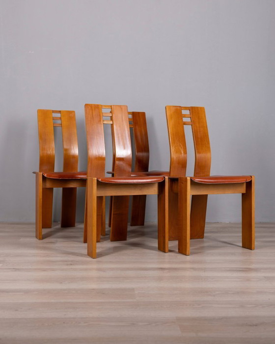 Ensemble de quatre chaises à structure en bois et dossier incurvé, assise en cuir, design italien, années 1950.