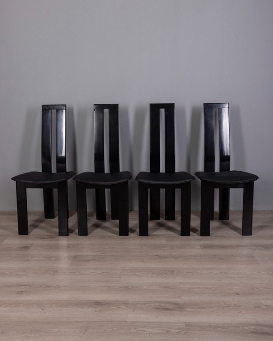 Ensemble de quatre chaises à structure en bois laqué noir et assise en cuir noir, conçues par Pietro Costantini pour Ello, années 1970.