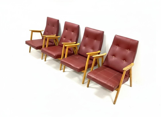 Ensemble de quatre fauteuils rétro élégants et confortables, fabriqués en Tchécoslovaquie dans les années 1960 par Interiér Praha. Dotés d'une structure en bois massif, d'accoudoirs élégamment incurvés et d'un revêtement en similicuir bordeaux, ces fauteuils apportent un charme intemporel du milieu du siècle.