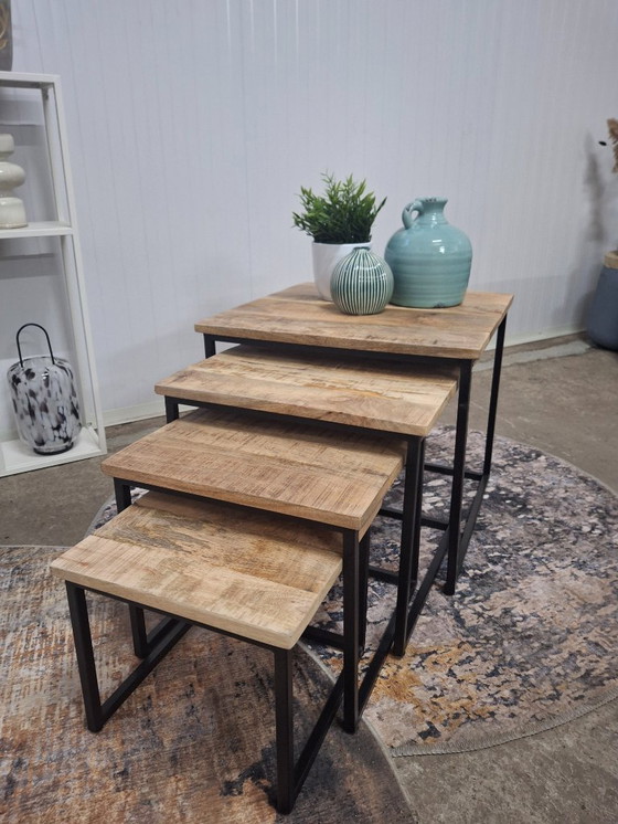 Ensemble de 4 tables basses en bois de manguier et métal, neuves