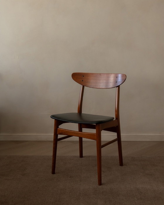 Ensemble de 6 chaises de salle à manger danoises vintage du milieu du XXe siècle · Teck et Skai noir
